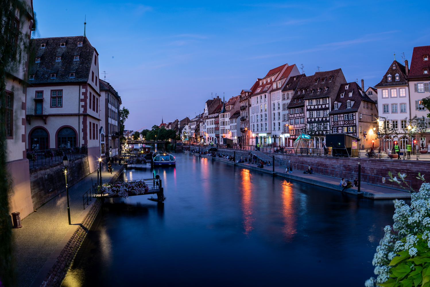 Die Ufer der Ill und der zahlreichen Kanäle der Stadt waren dicht belegt mit Menschen die das schöne Wetter für einen gemütlichen Abend am Wasser nutzten. Wir machten die Runde über die gedeckte Brücke und entlang der Ill zurück zur Kathedrale die wir zur blauen Stunde erreichten.