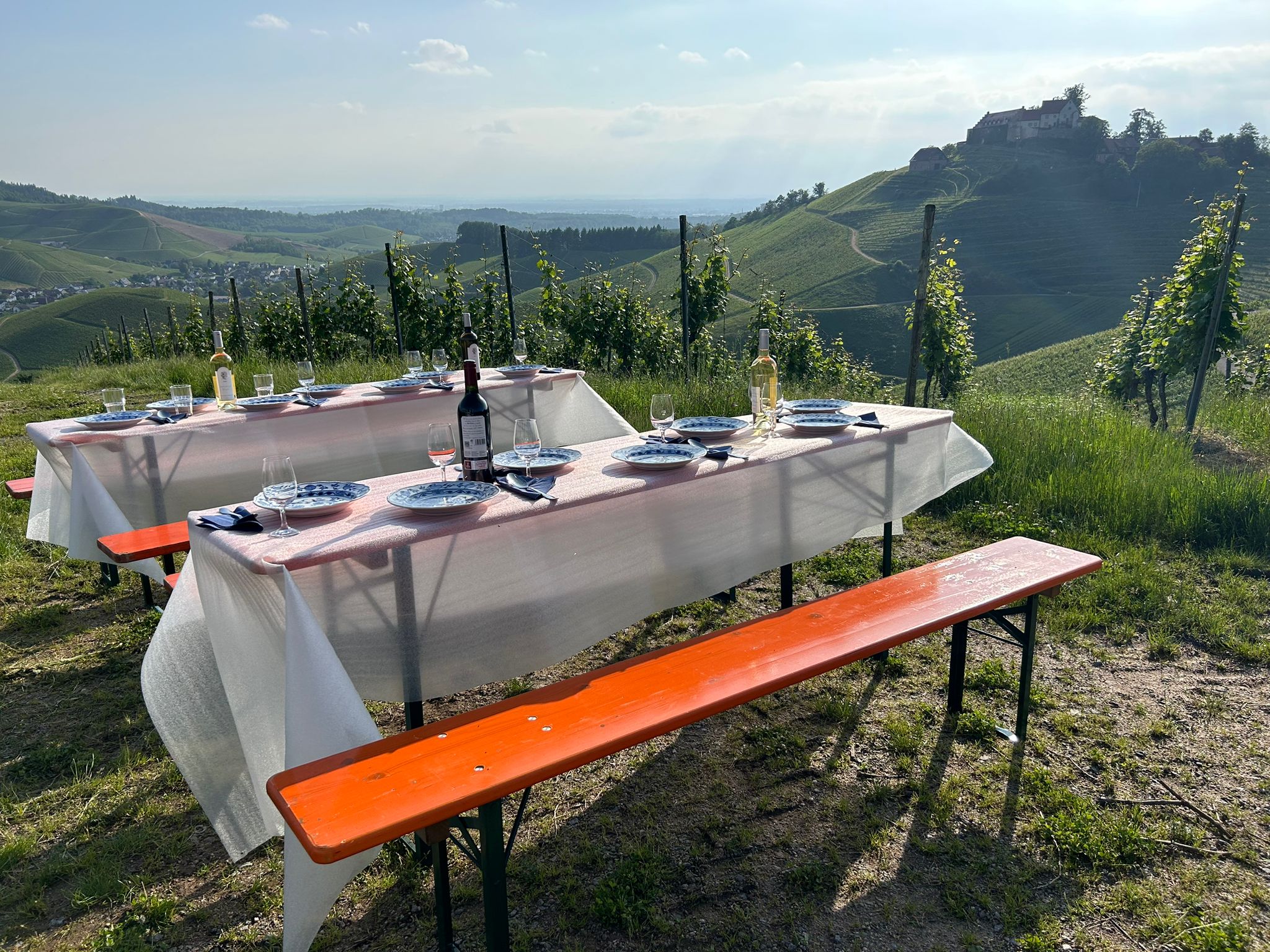 Dieses märchenhafte Flair und die wunderbare Skyline sind heute gegenwärtig wie eh und je, ein Eldorado für Fotografen. Trotz geschlossener Gastronomie den Abend stilgerecht zu vollenden, wartete eine große Überraschung auf uns. Karl hat gedeckte Tische, eine köstliche Suppe, Baguettes und dortige Spitzenweine für uns vorbereitet, so dass die Gaumenfreude mit der zauberhaften Abendstimmung innerhalb der Rebberge und mit Blick auf das Schloss gesteigert genossen werden konnte. Fackeln waren entzündet, um die hereinbrechende Dunkelheit in geheimnisvolles Licht zu versetzen. Da gilt es, auch an dieser Stelle Karl Boos von Herzen unseren Dank auszusprechen.