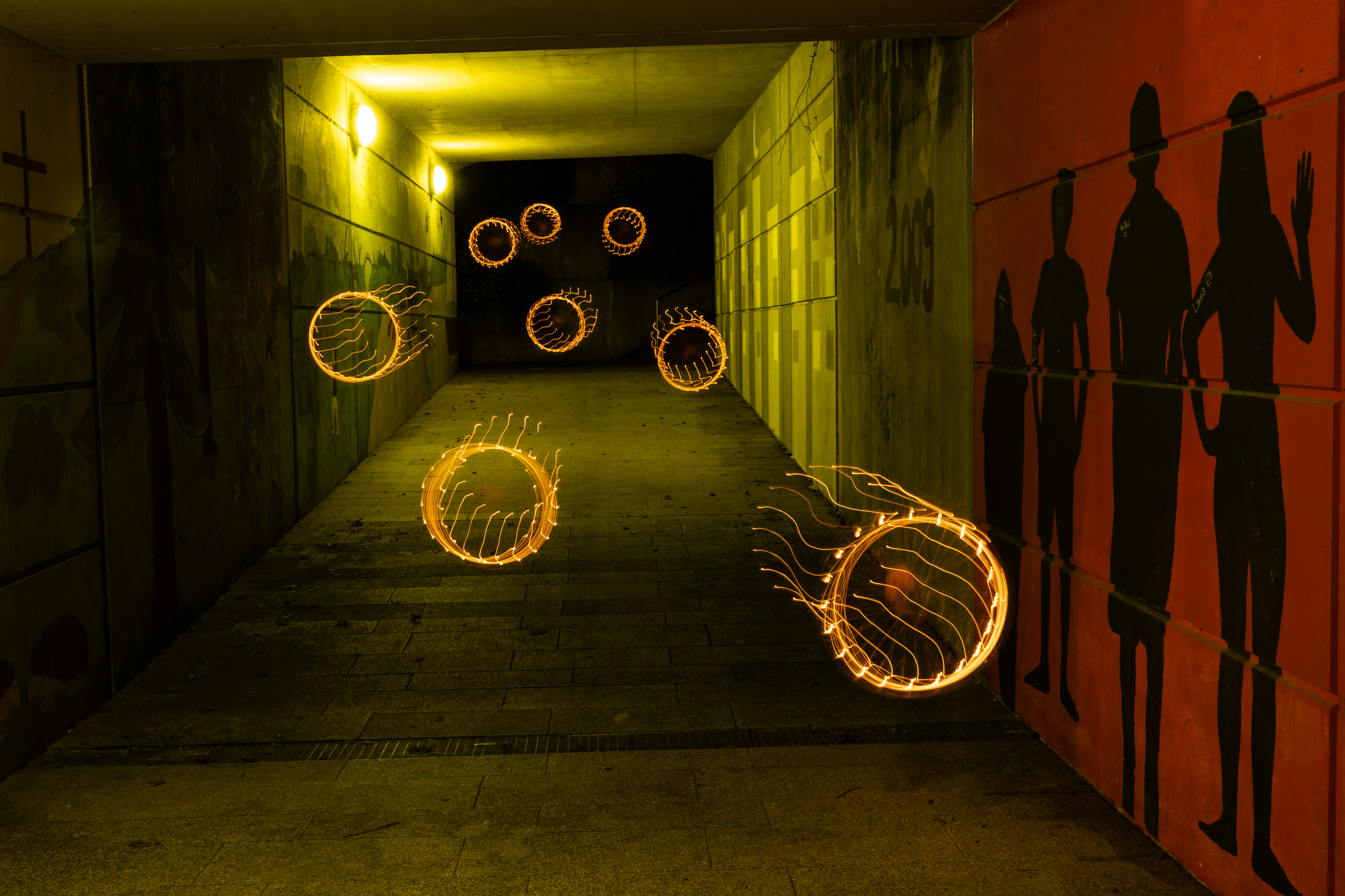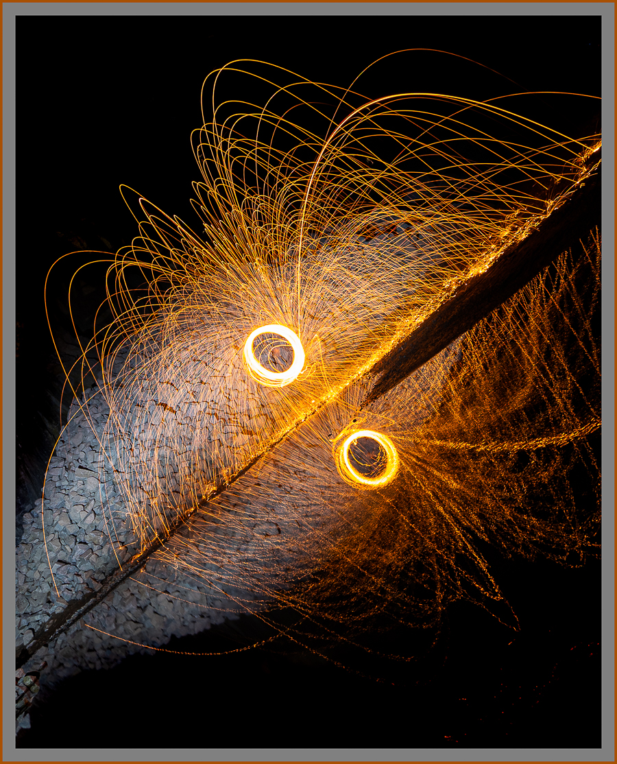 Der zweite Abend widmete sich der Verwendung selbstgebauter Lichtquellen und der spektakulären Technik des Lightpaintings mit brennender Stahlwolle. Mit großer Begeisterung experimentierten die Teilnehmer mit ungewöhnlichen Lichtquellen, die sie eigens für den Workshop konzipiert hatten. Dabei entstanden individuelle Werke, die die persönliche Handschrift jedes Fotografen widerspiegelten. Das Highlight des Abends war der Einsatz brennender Stahlwolle, die funkelnde Lichtkaskaden erzeugte und die nächtliche Szenerie des Steinbruchs in ein visuelles Feuerwerk verwandelte.