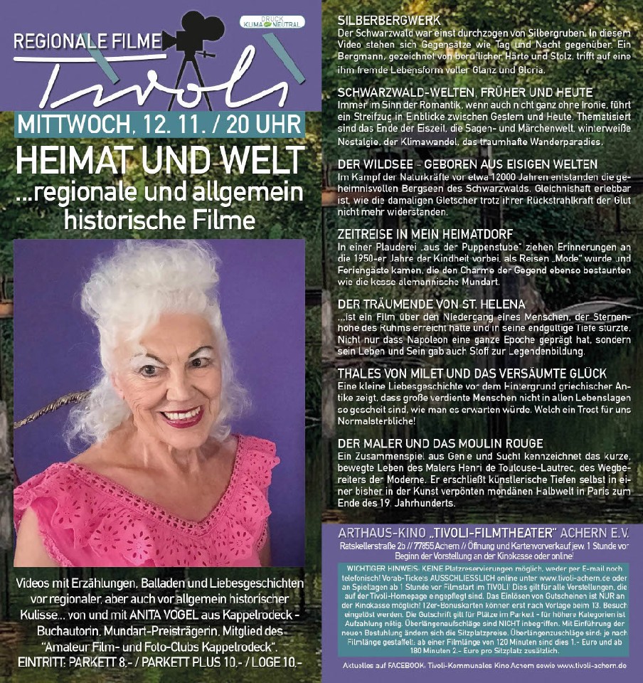 Anita Vogel zeigt Heimat und Welt regionale und allgemein historische Filme. Am Mittwoch den 12. November 2025 im Tivoli-Filmtheater in Achern