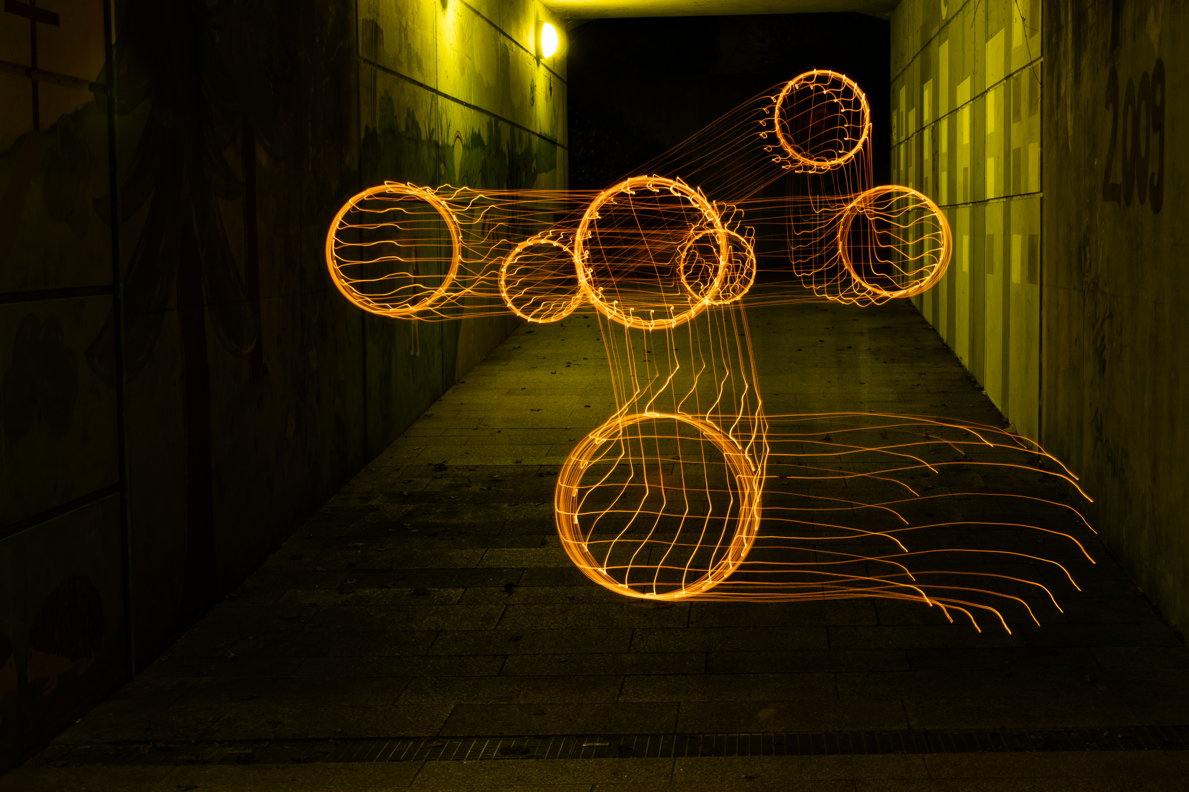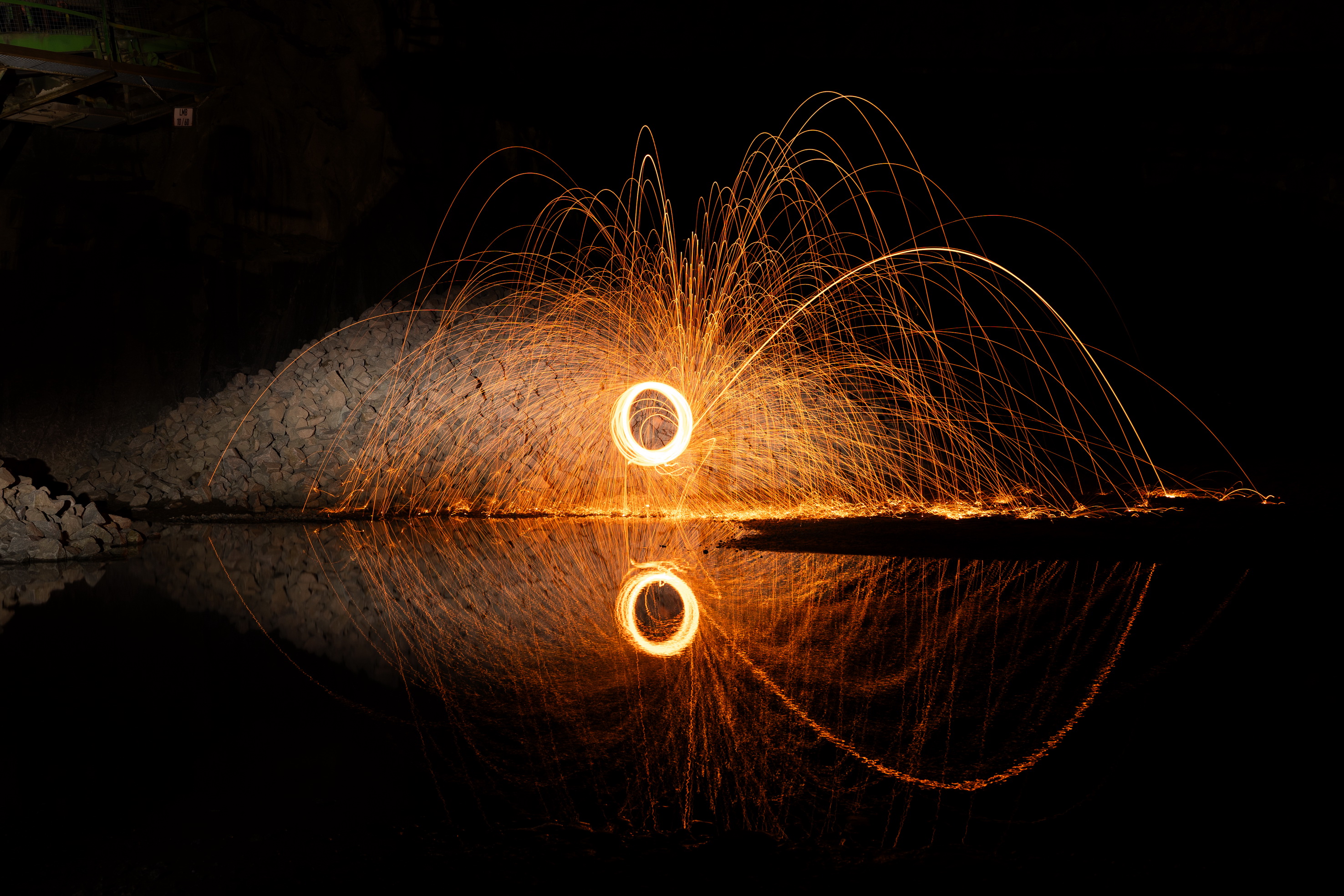 Der zweite Abend widmete sich der Verwendung selbstgebauter Lichtquellen und der spektakulären Technik des Lightpaintings mit brennender Stahlwolle. Mit großer Begeisterung experimentierten die Teilnehmer mit ungewöhnlichen Lichtquellen, die sie eigens für den Workshop konzipiert hatten. Dabei entstanden individuelle Werke, die die persönliche Handschrift jedes Fotografen widerspiegelten. Das Highlight des Abends war der Einsatz brennender Stahlwolle, die funkelnde Lichtkaskaden erzeugte und die nächtliche Szenerie des Steinbruchs in ein visuelles Feuerwerk verwandelte.
